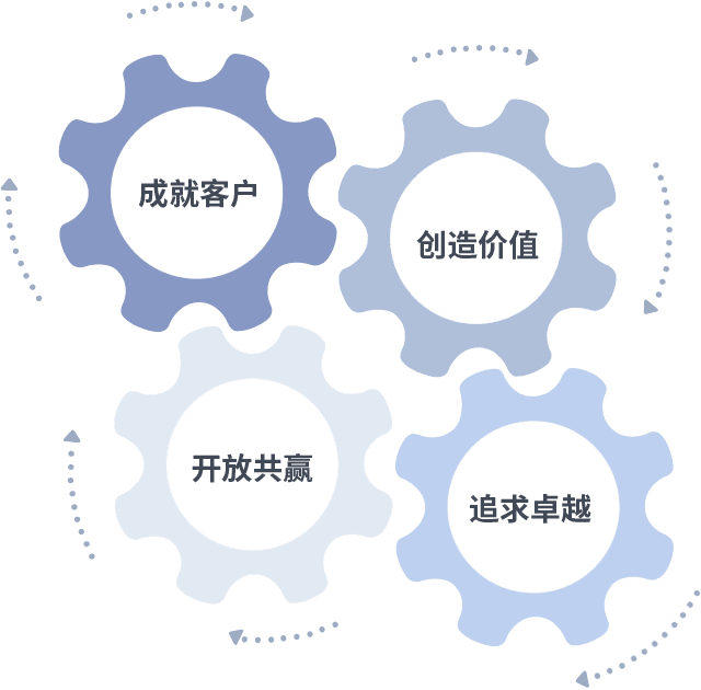 成就客户是一切决策的出发点,,创造价值是衡量所有工作的标准,,,追求卓越是我们做事做人的态度,,开放共赢是我们的格局也是最终的结果。。价值观的齿轮环环相扣,,,推动着组织里的每个人不断向前。。