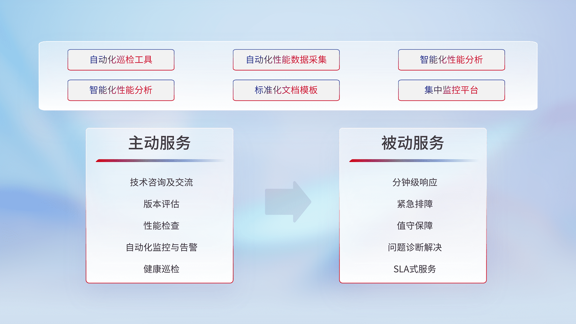 智能化工具和标准化文档,,保障服务质量,,,,提供主动服务(包含技术咨询、、版本评估、、性能检查、、自动化监控与告警、、、、健康巡检)和被动服务包含(分钟级响应、、、、紧急排障、、值守保障、、、、问题诊断解决、、SLA服务)。。。。