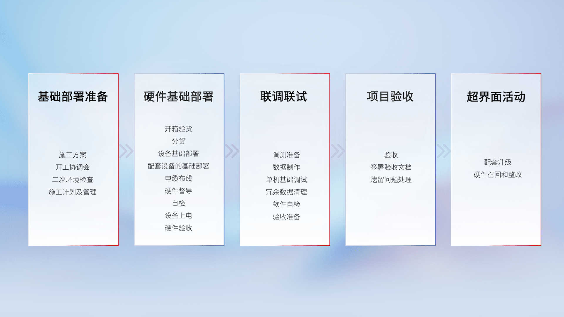 从基础部署准备、、、、硬件基础部署、、联调联试、、、项目验收、、、、越界面活动的全过程可追溯,,,,保证施工质量和进度。。。